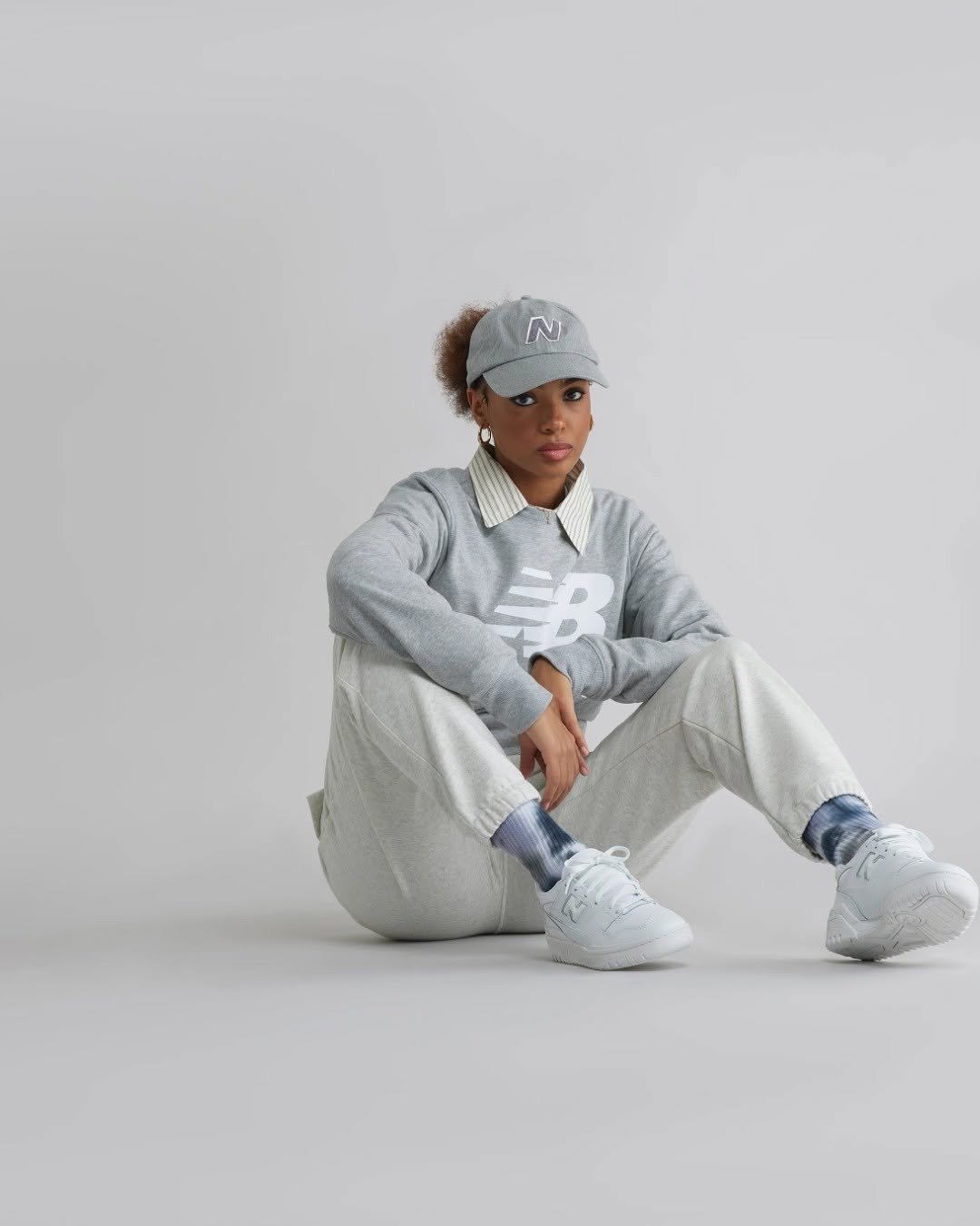 This outfit leans fully into that relaxed sporty aesthetic. The monochrome grey set feels modern and clean, while the baseball cap adds just enough attitude.