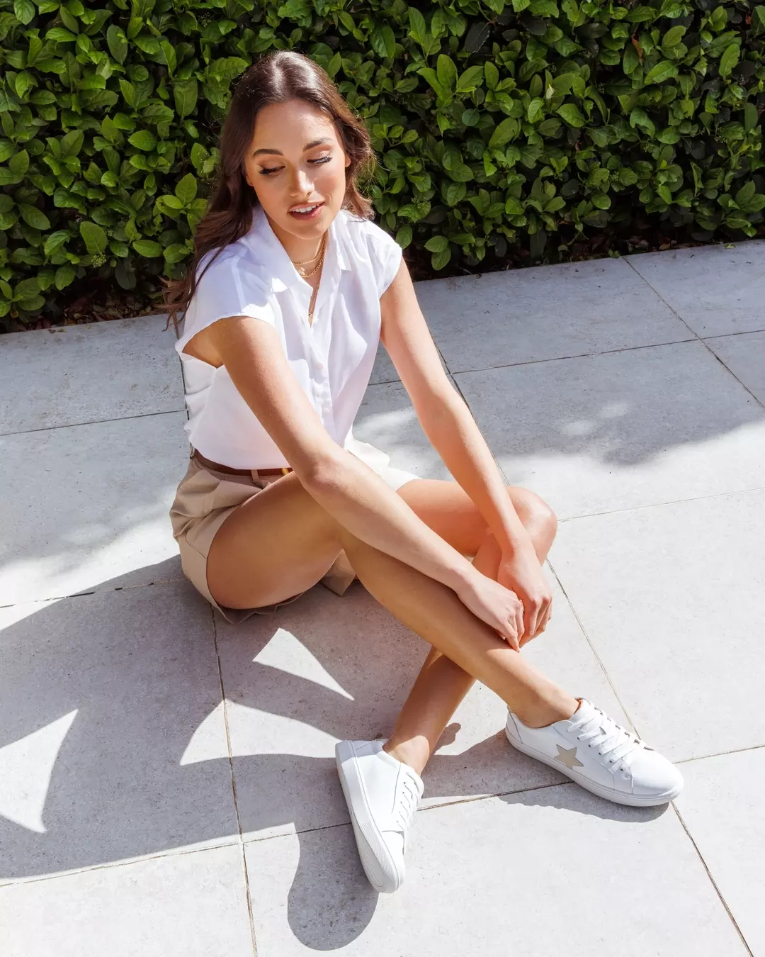 This look captures warm-weather simplicity in the best way. A crisp white blouse tucked into tailored shorts creates a light, polished outfit that feels perfect for sunny afternoons.