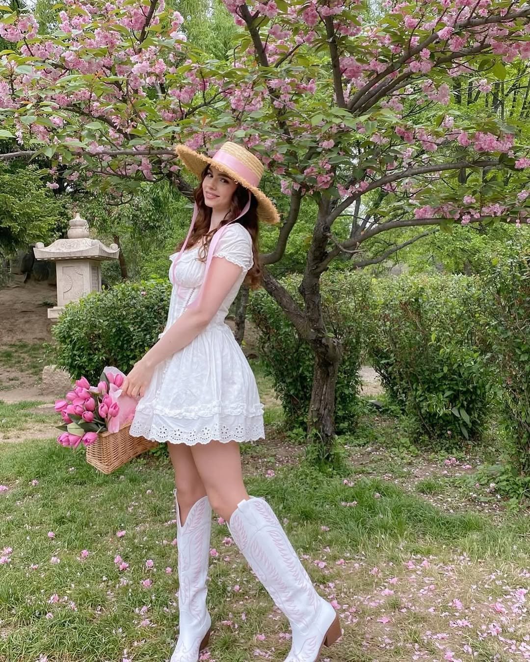 The wide straw hat and basket of flowers make the whole look feel almost cinematic. It’s the kind of outfit that turns a simple spring walk through blooming trees into a moment that feels a little magical.