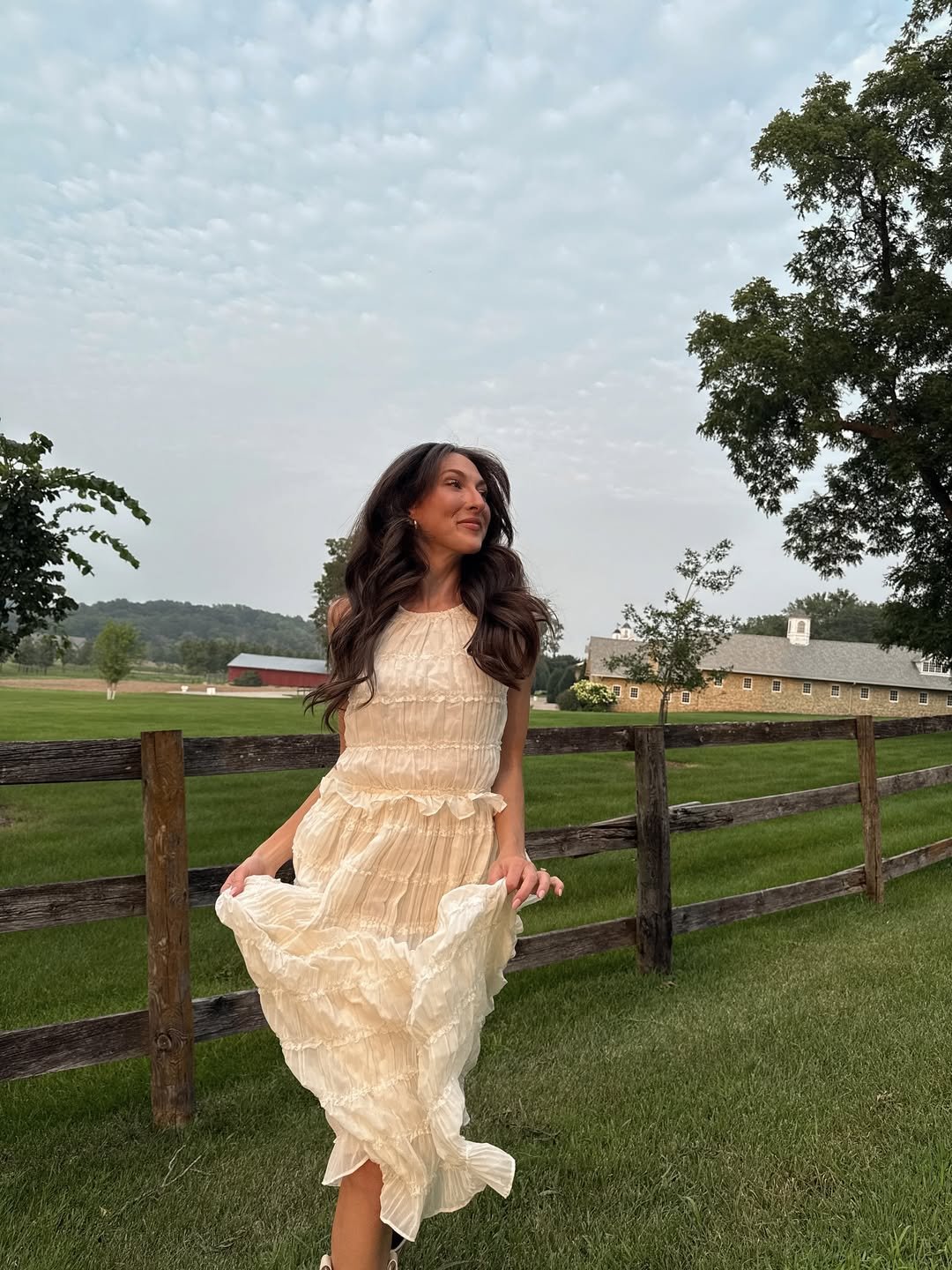 There’s something about a tiered ruffle dress in the middle of open countryside that feels straight out of a storybook. The soft cream fabric moves beautifully with the breeze, giving the whole look that relaxed, wandering-through-the-meadow feel.