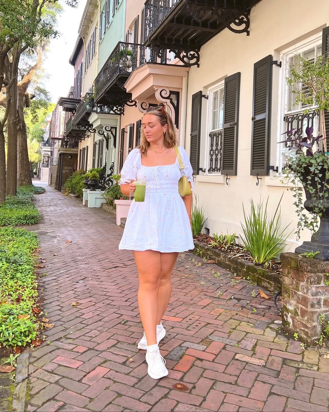 Paired with white sneakers and an iced matcha in hand, the whole look captures that casual weekend energy. It’s simple, fresh, and exactly what you’d wear while wandering through charming streets with nowhere to rush.