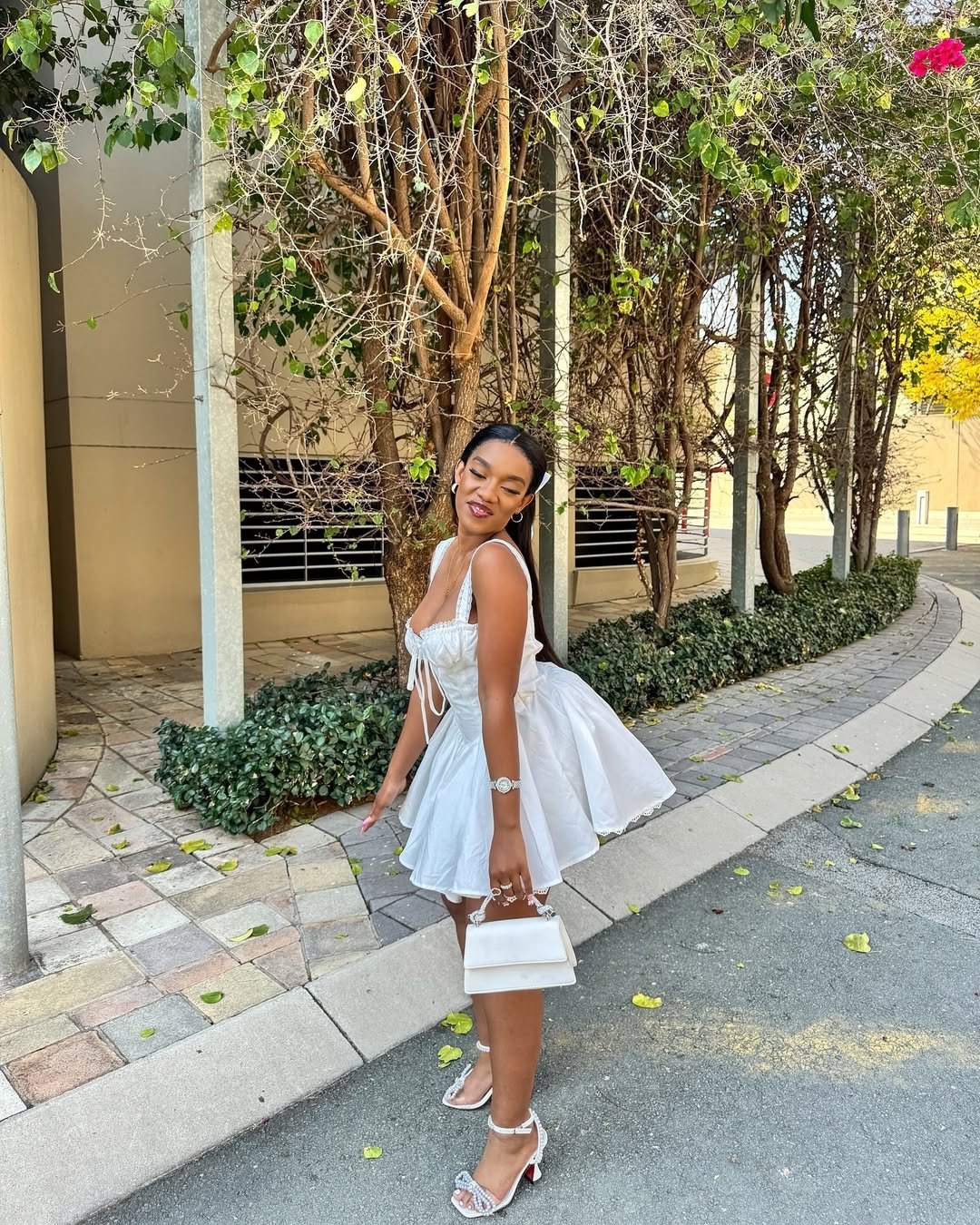 Paired with delicate heels and a tiny handbag, the look feels polished but still youthful. It’s exactly the kind of outfit that works for brunch dates, rooftop drinks, or a spontaneous night out.