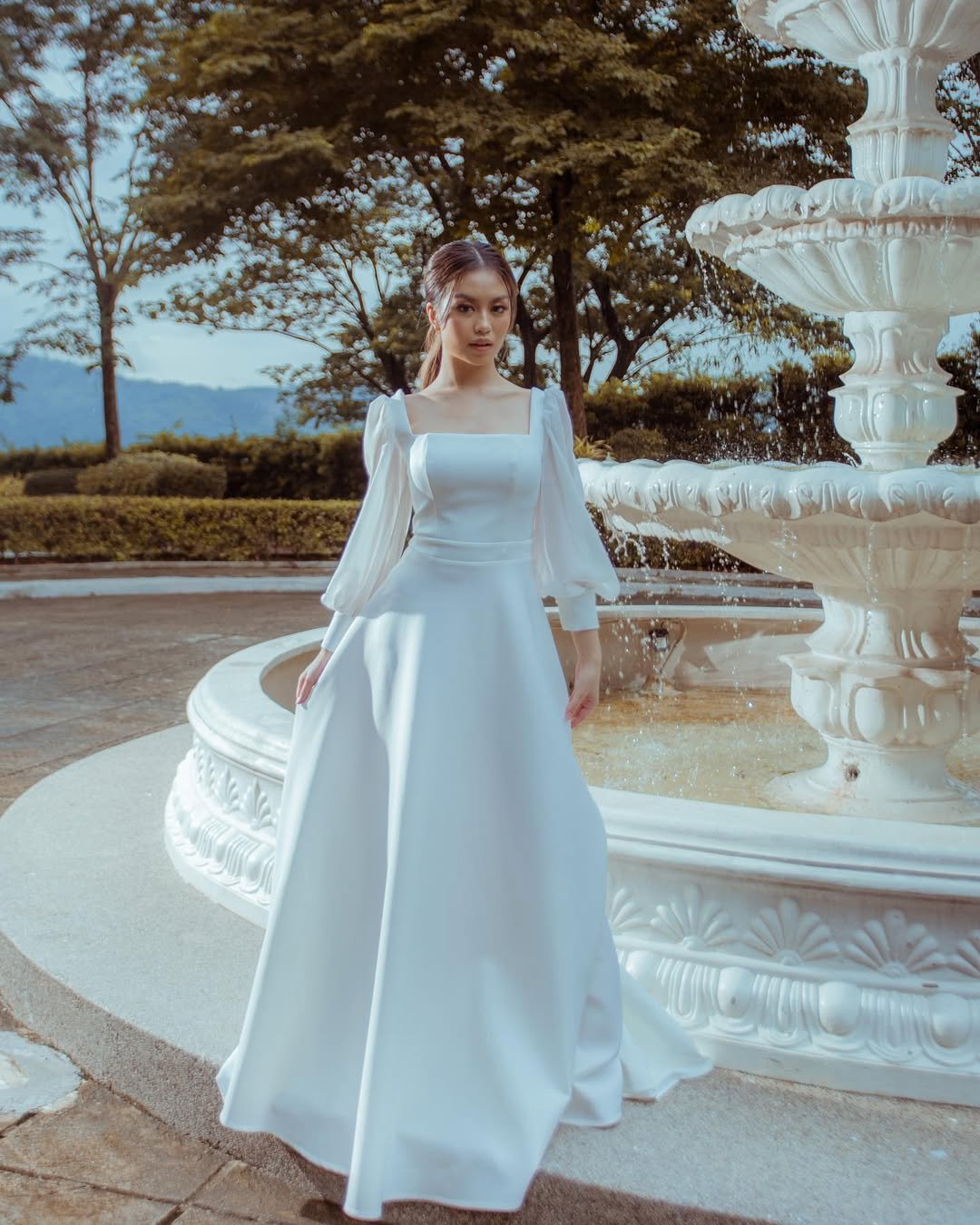 There’s something almost cinematic about this look. The structured bodice and flowing skirt create a silhouette that feels elegant and classic, especially beside that grand white fountain.