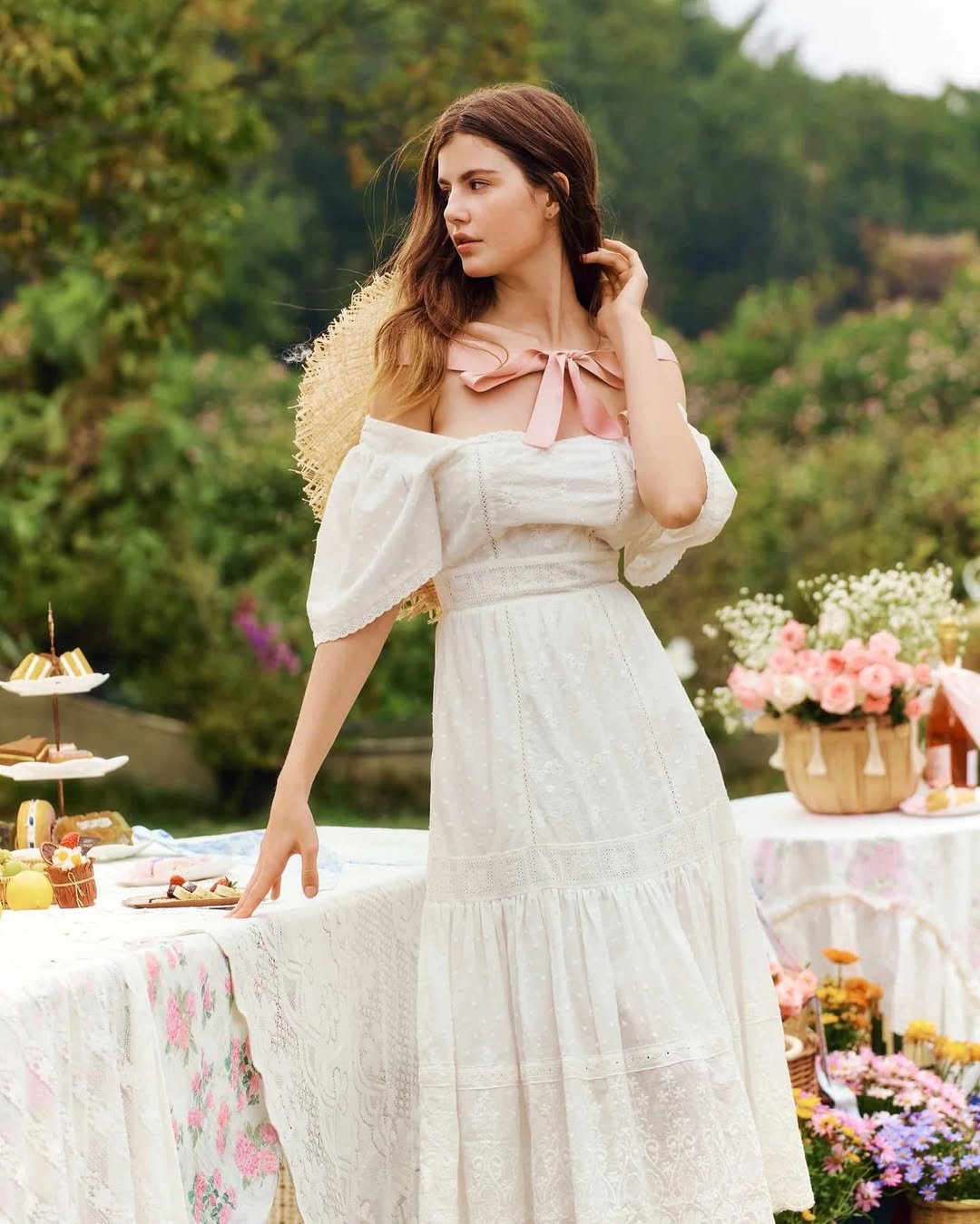Standing among pastel blooms and patterned linens, the whole look leans into that dreamy cottage aesthetic. It’s feminine, graceful, and perfect for a slow afternoon outdoors.