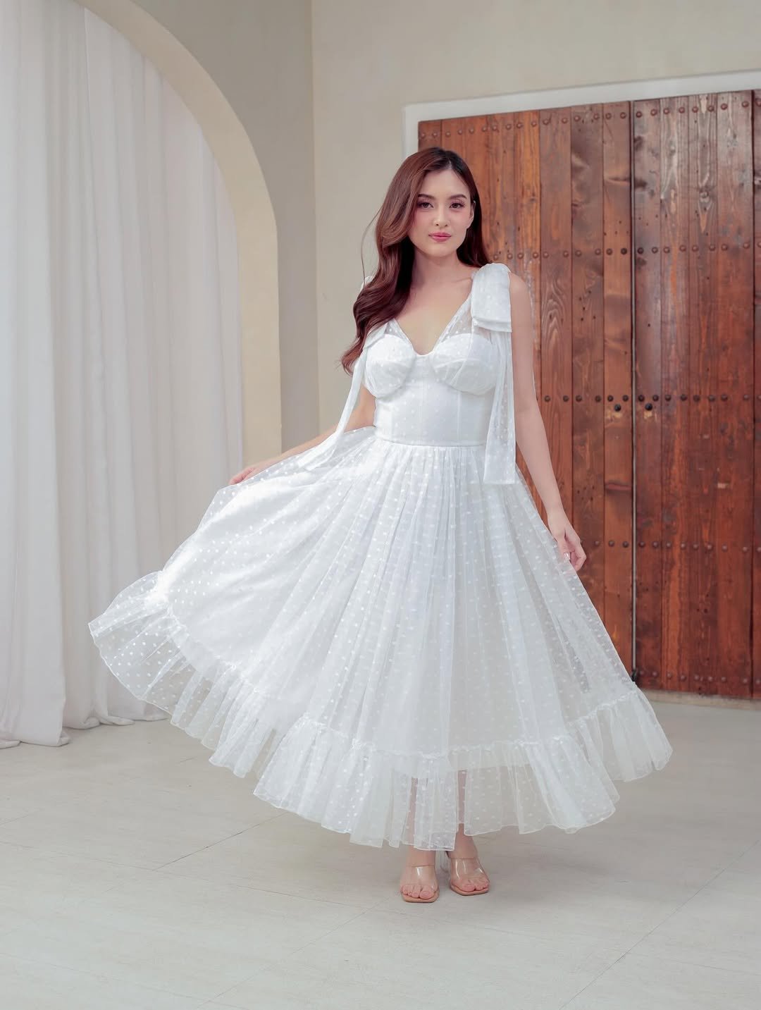 This dress feels like it belongs at a spring garden gathering. The soft tulle layers and delicate dotted texture create that floaty movement that instantly makes the whole silhouette feel light and romantic.
