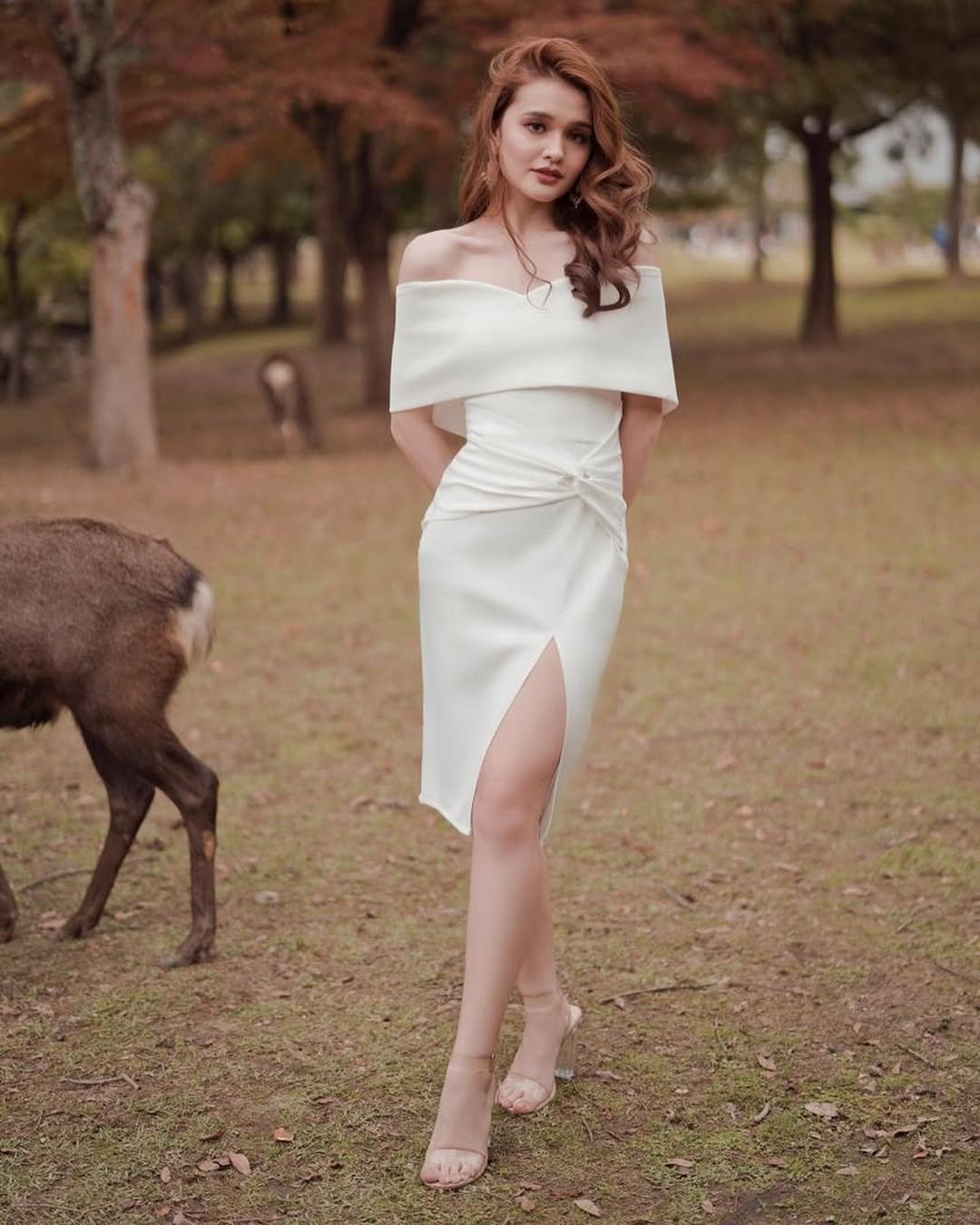 And that subtle slit adds just the right amount of drama. Paired with minimal heels and a quiet park setting, the whole look carries that understated evening elegance.