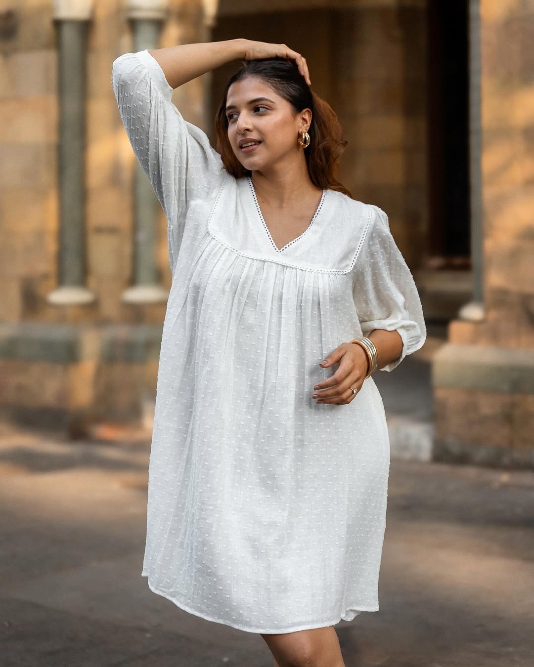 Not every white dress has to feel delicate or formal. This one leans fully into comfort, with its loose silhouette and textured cotton fabric that moves easily with the body.