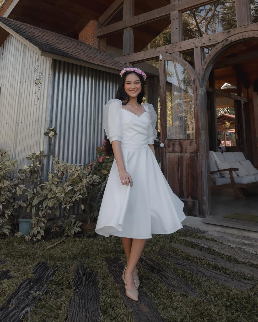 Standing outside that rustic doorway with a delicate flower crown, the whole scene feels warm and welcoming. It’s the kind of dress that quietly steals the moment.