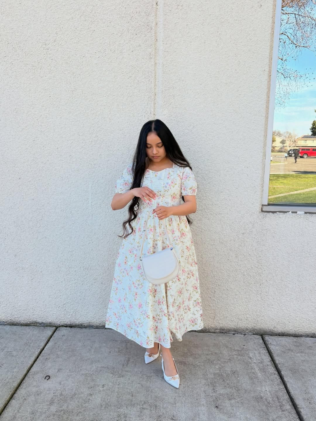 Paired with classic white heels and a simple shoulder bag, the outfit feels polished without losing that relaxed daytime feel. It’s the kind of dress you wear when you want the day to feel a little softer and a little prettier.
