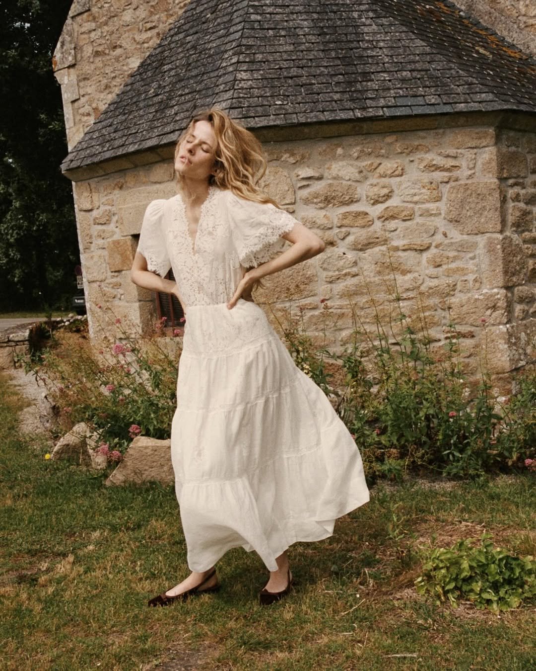 Standing beside that old stone building, the whole look feels like a scene from a quiet countryside afternoon. It’s simple, romantic, and the kind of dress that feels even better the longer you wear it.