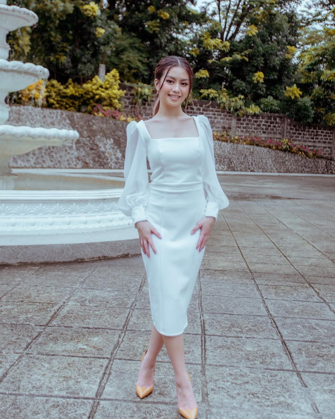 Standing in front of the fountain with that calm garden backdrop, the outfit feels poised without being formal. It’s polished in the most effortless way.