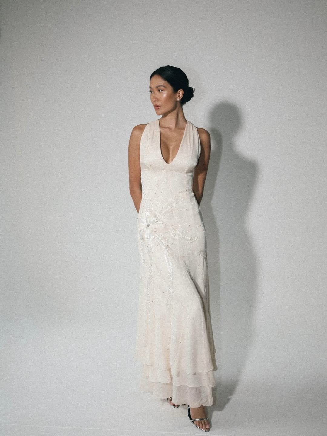 Set against the rustic stone backdrop, the dress almost feels like it belongs there. It’s graceful and understated, perfect for slow countryside afternoons or a spring wedding tucked away in nature.