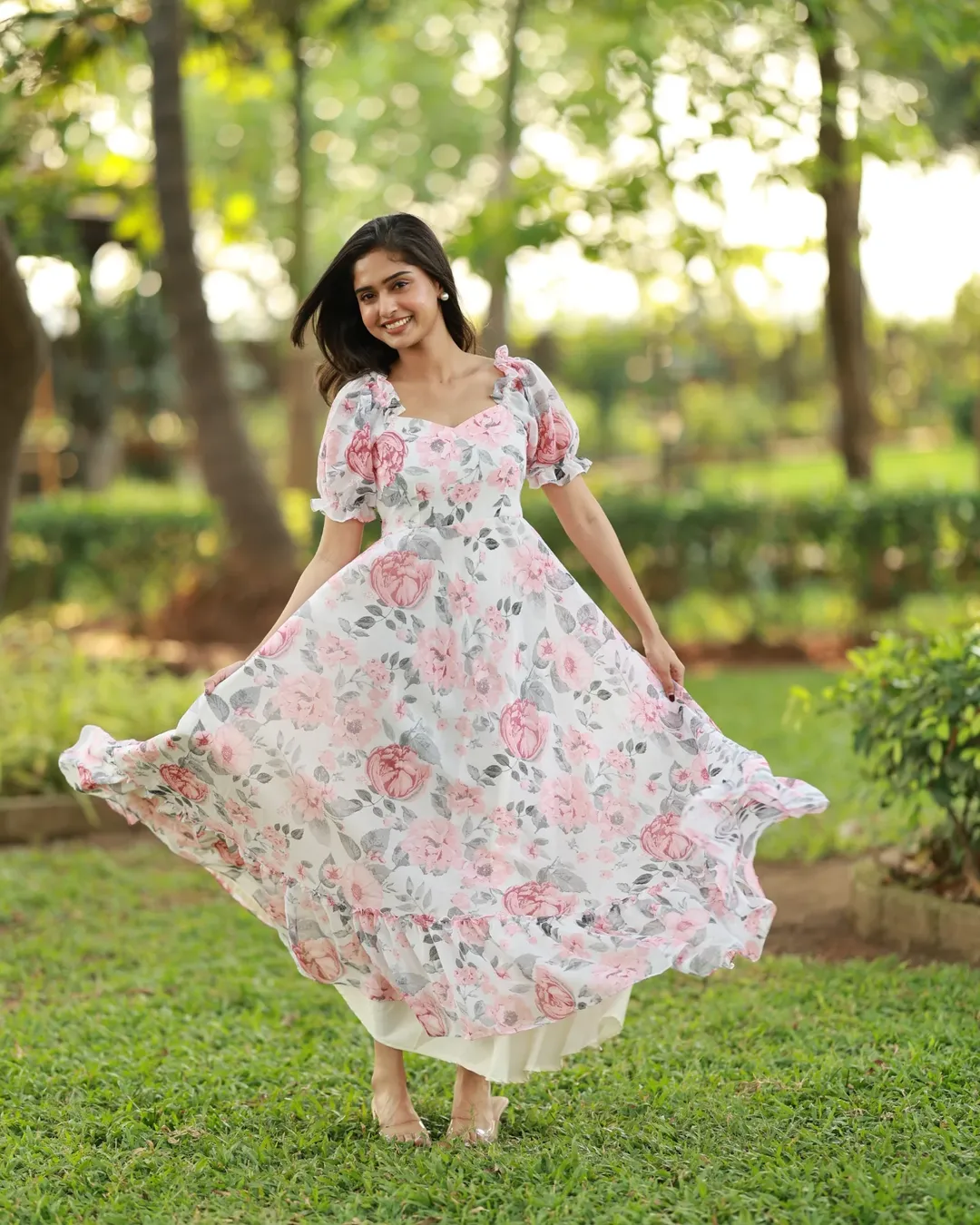 There’s something undeniably joyful about a dress that moves like this. The airy chiffon fabric and blooming pink florals create a soft, romantic silhouette that feels made for warm days in the park.