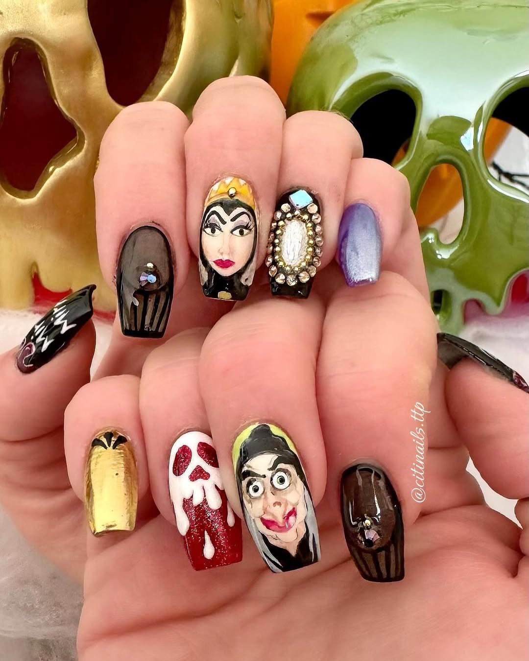 Now this is full-on villain glam. @citinails.ttp serves a nail set that’s practically dripping with diabolical drama—hand-painted Evil Queen, poisoned apple, and mirror mirror jewels, all framed in moody hues. Each nail is its own twisted tale, like a wicked bedtime story told over cocktails. Bonus points for the shimmer gradient and glass-like gems that say: “Yes, I’m the bad guy—and I look fabulous.”