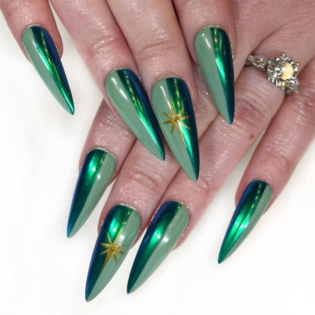 Now this is a power move. These sculpted stiletto nails blend high-shine emerald chrome with sagey matte green—like potion meets polish. And the gold starburst? It’s giving “book of shadows meets designer handbag.” Completely sharp, completely polished, and not for the faint of heart.