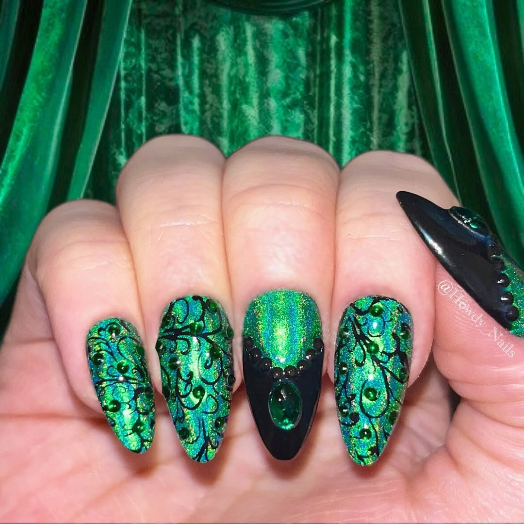 @howdy_nails drops a gem—literally. These nails are dripping in holographic green shimmer, swirling vines, and gemstone accents fit for an enchanted queen. And that witch-hat pinky? Obsessed. This set feels like a magical relic pulled from a velvet-lined chest—ornate, extra, and unapologetically theatrical.