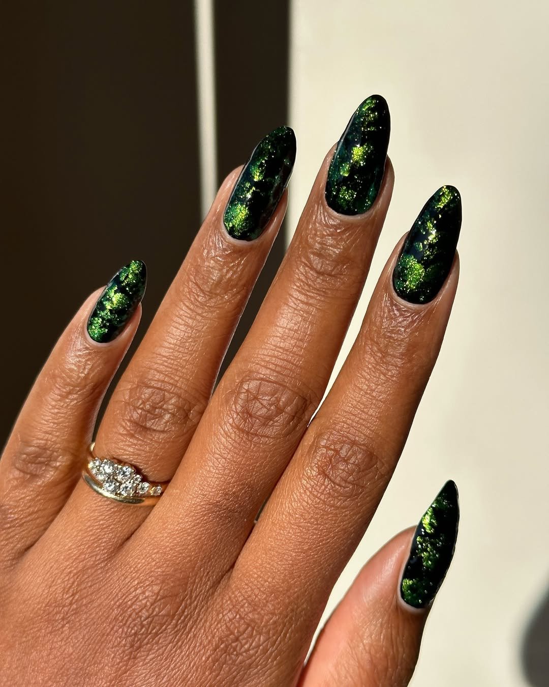 Moody meets mystic in this deep green smoke effect by @melanated.mani. The gold flecks catch light like fairy dust, glowing through the dark like embers in a forest ritual. It’s giving midnight enchantress, casting spells with just a flick of the wrist.