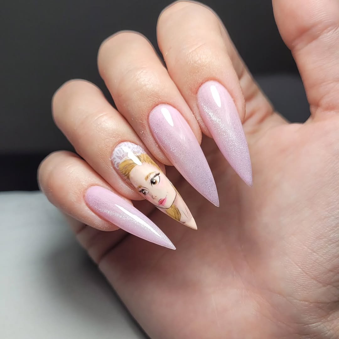 And for those who walk the glitter path, the good witch side of @nailsart_ari’s artistry is soft and radiant. Pale pink shimmer, a luminous Glinda portrait, and that sugar-spun sparkle? It’s the perfect counterpart to her darker set. A reminder that witches wear blush too.