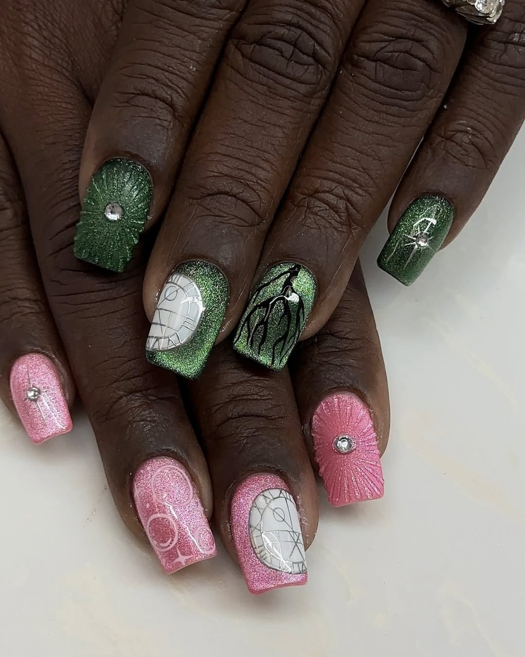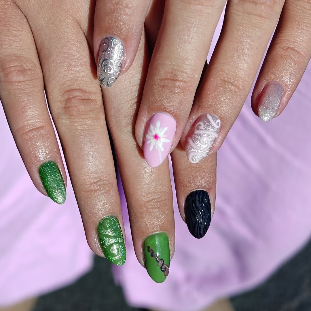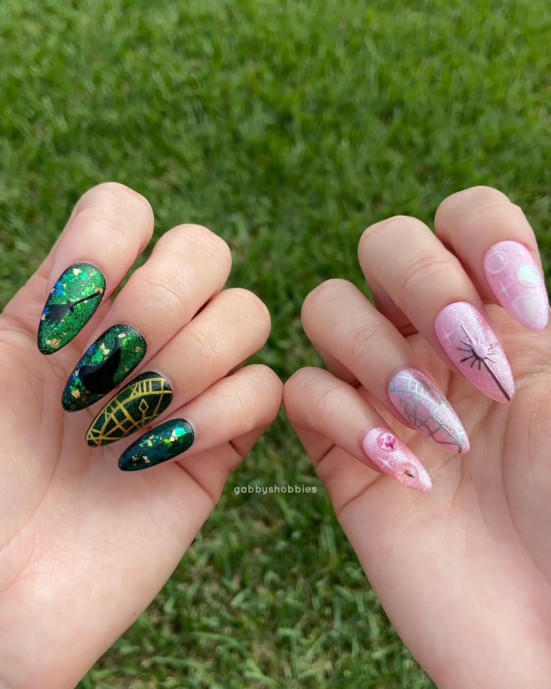 This mani dances between the realms of good and wicked—because let’s be honest, witches contain multitudes. @benny._.nails blends glittery emerald, soft pink, and a hint of dark textured polish into a tribute to Wicked, complete with Glinda’s shimmer and Elphaba’s edge. Each finger feels like a spellbook page, from dainty vines to icy glyphs. It’s playful, theatrical, and slightly chaotic in the best way.