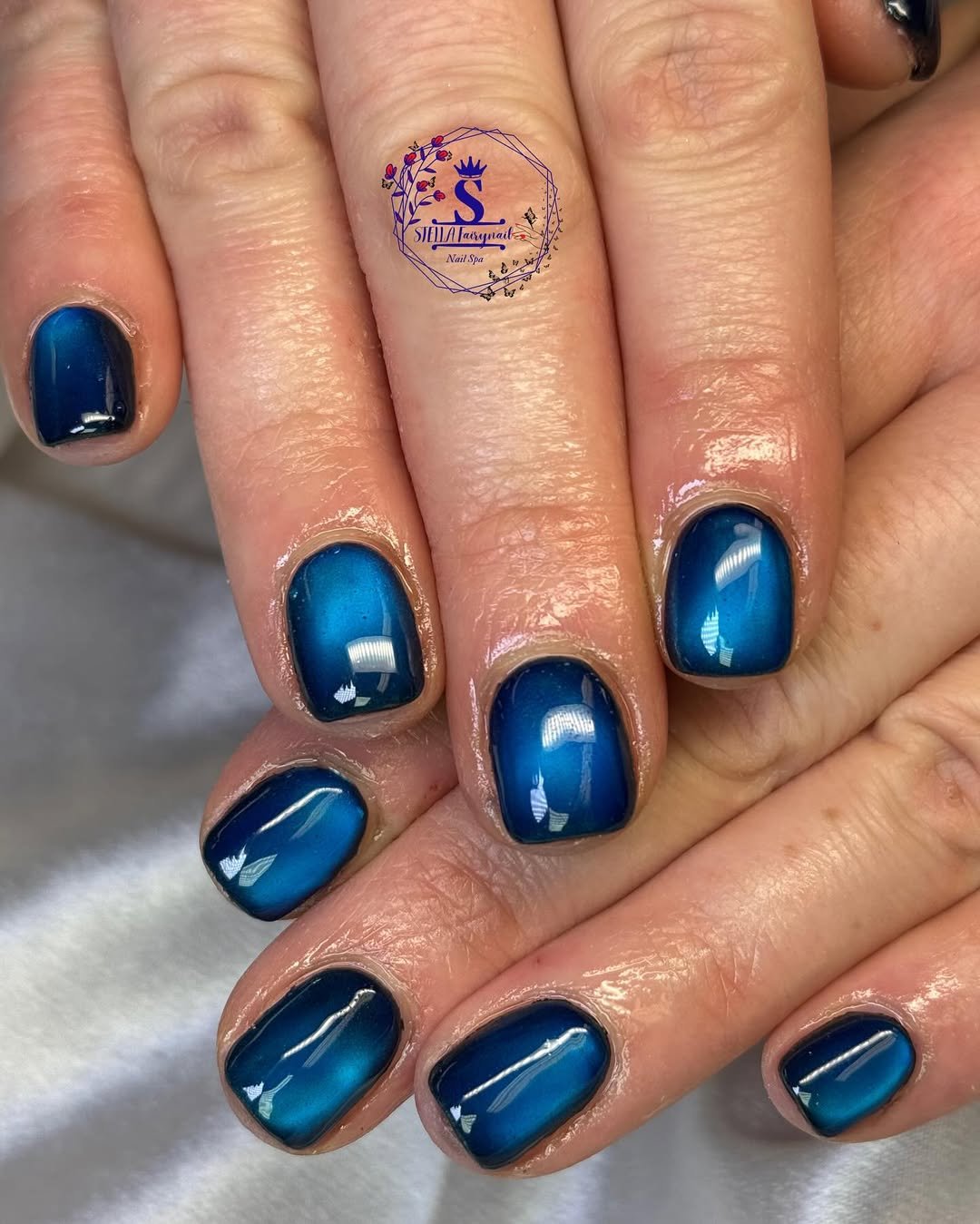 Rich sapphire cat-eye nails that look like the depths of winter night skies—icy, dramatic, and beautifully reflective. The color radiates from the center, giving that aura glow effect that feels alive.