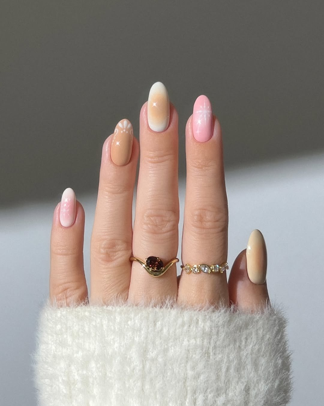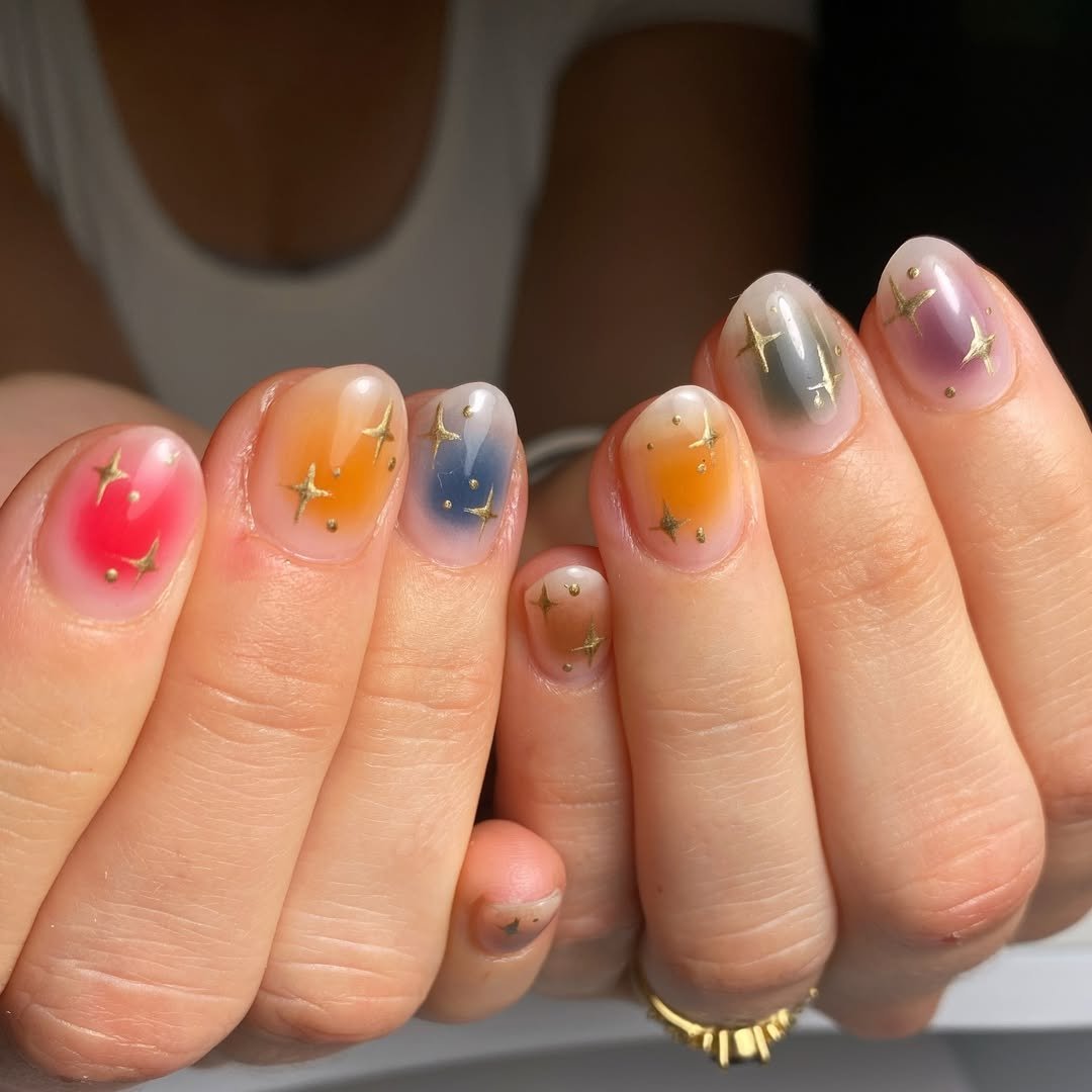 A dreamy color story of blush pinks, sunset oranges, misty blues, and lilac haze—each nail feels like a soft watercolor moment. The golden star accents scattered across the translucent base bring the perfect dose of sparkle.