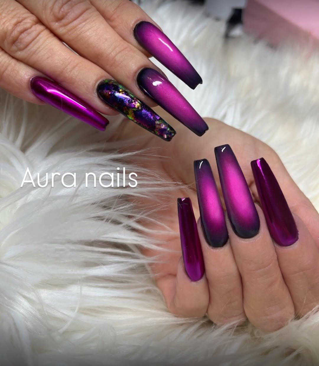 These nails are pure intergalactic energy. The rich magenta chrome glows with a cat-eye effect that pulls you right in. It’s vibrant, mysterious, and oh-so captivating—like the Northern Lights decided to rest on your fingertips.