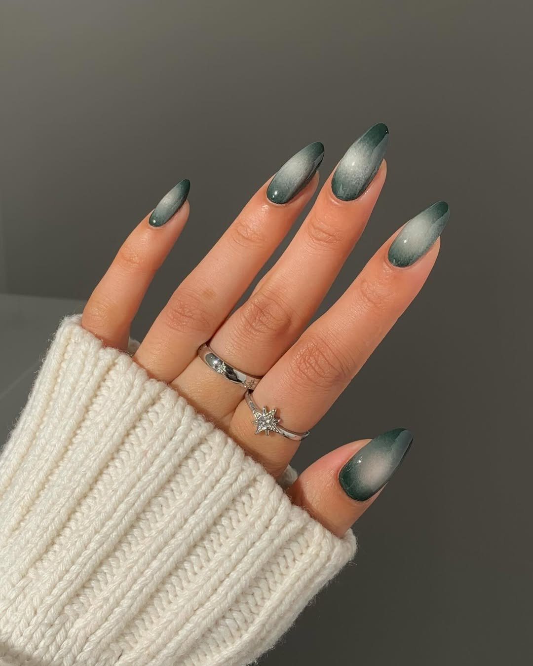 Cool and captivating, this forest-green cat-eye manicure has a magnetic pull (literally). The gradient of deep green to silver shimmer feels like mist rolling through pine trees at dawn.