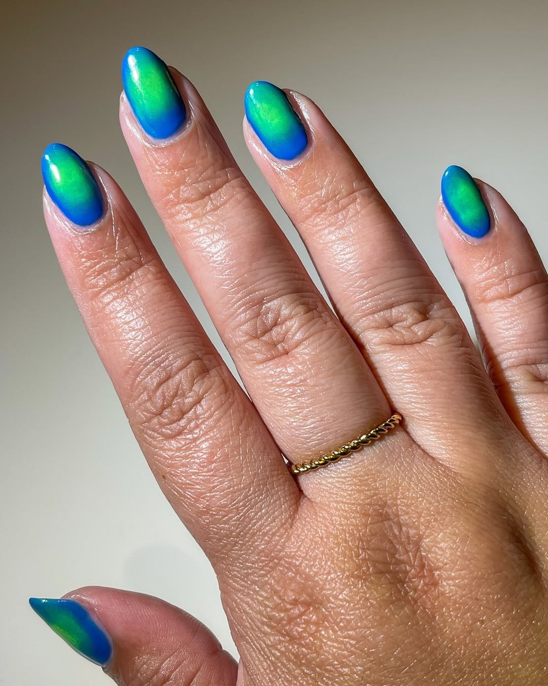 Blue and green meet in this perfect gradient that mimics the Northern Lights. It’s icy, vibrant, and a little hypnotic—like standing under an aurora in the middle of winter.