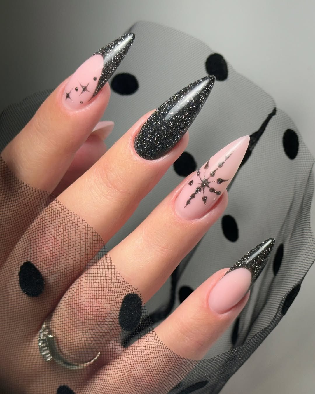 This one’s pure night-sky elegance. The sharp stiletto shape paired with pink-nude tones and glittery black tips makes every flick of your hand look intentional. It’s dramatic but balanced—soft and strong at the same time. The black sparkle gradients melt into the nude base, creating that perfect celestial illusion.
