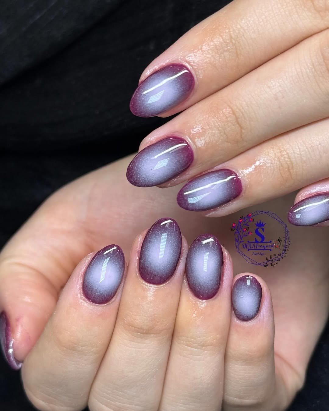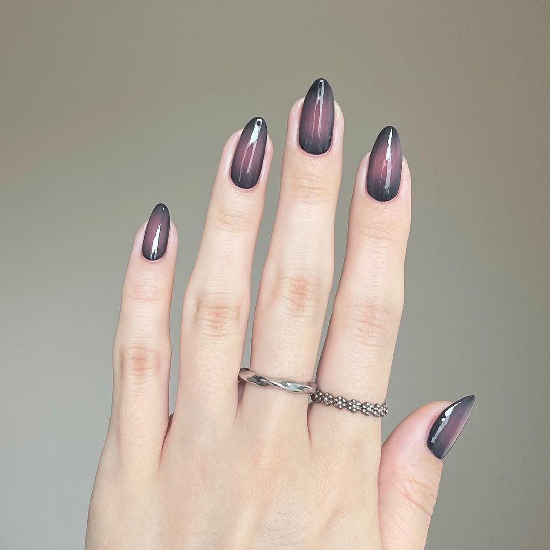The contrast between the deep berry edge and silvery core makes it glow from within. It’s understated magic, perfect for the “quiet luxury” nail trend.