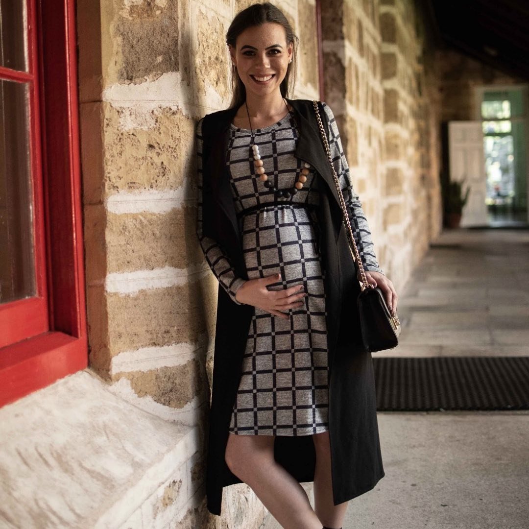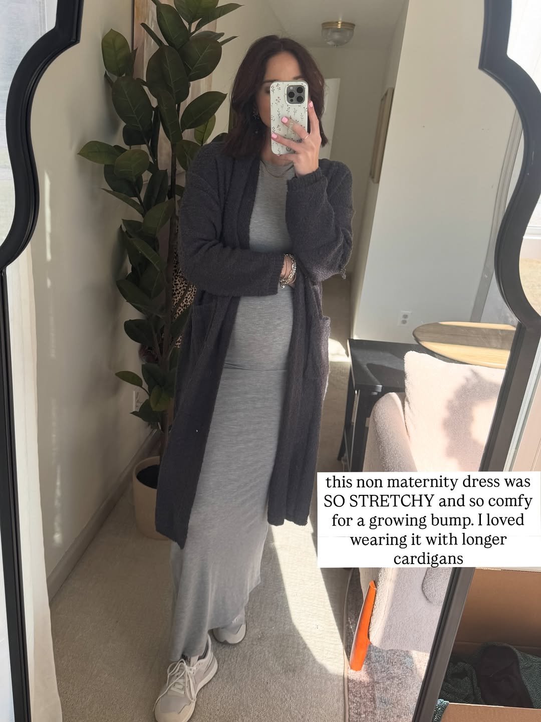 There’s something so comforting about this look — the kind of winter outfit that feels like a warm exhale. The ultra-stretchy grey dress hugs the bump just right, creating that smooth, effortless silhouette, while the long charcoal cardigan drapes over it with a soft, lived-in coziness. It’s simple, but in that elevated “I know my style even on the chilliest mornings” kind of way.