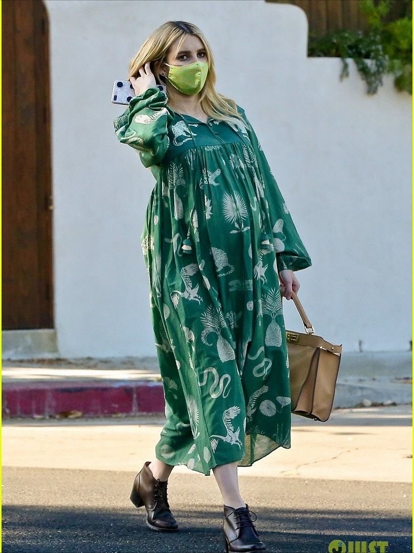 There’s something undeniably charming about a loose, airy maxi on a winter afternoon — especially one in this deep, storybook emerald. The whimsical print brings a playful edge, almost like a vintage wallpaper brought to life, and the relaxed silhouette lets the bump breathe while still feeling intentional.