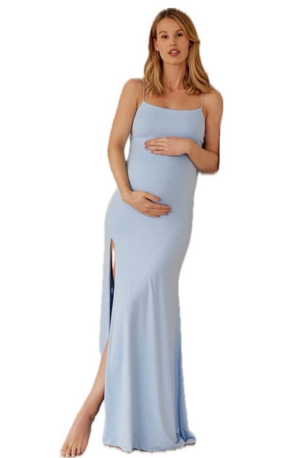 There’s a cool serenity to this icy blue dress — like winter frost translated into fabric. The stretch and smoothness hug the bump just right, while the slit adds fluid movement that feels elegant rather than flashy.