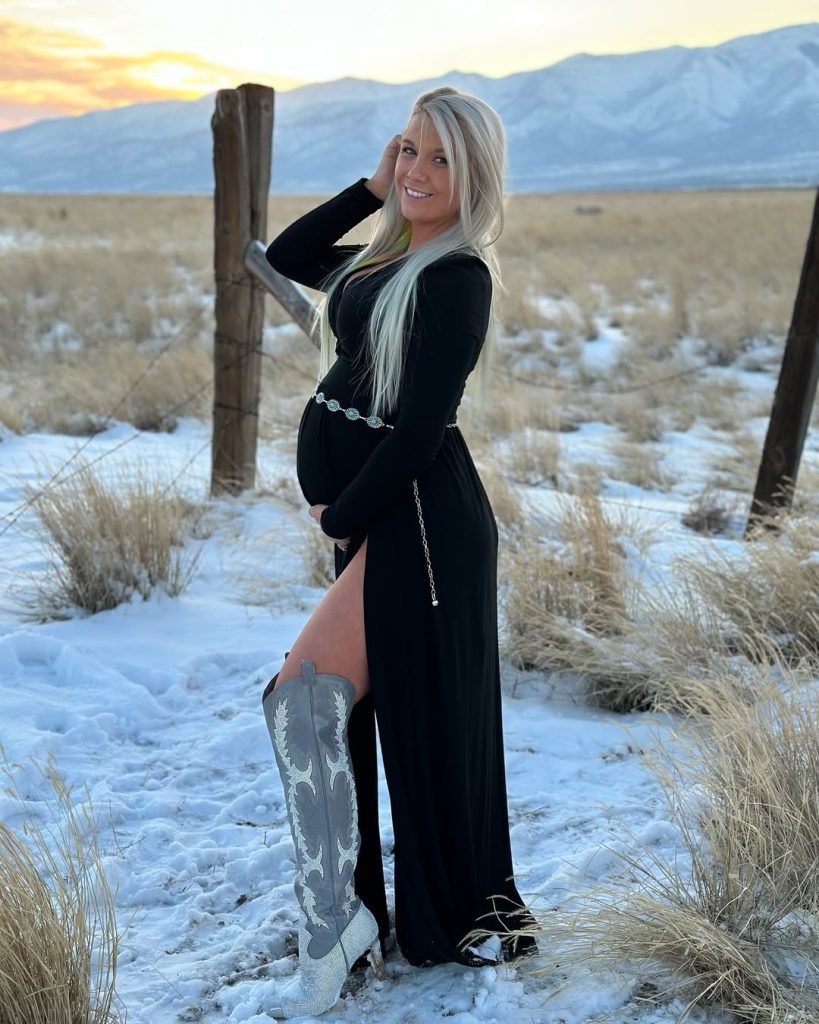 This is the definition of western glam meeting winter magic. The long black dress drapes beautifully over the bump, and that sky-high side slit adds just the right amount of drama against the snowy backdrop. Paired with embroidered knee-high boots, the look becomes bold, feminine, and seriously stunning.