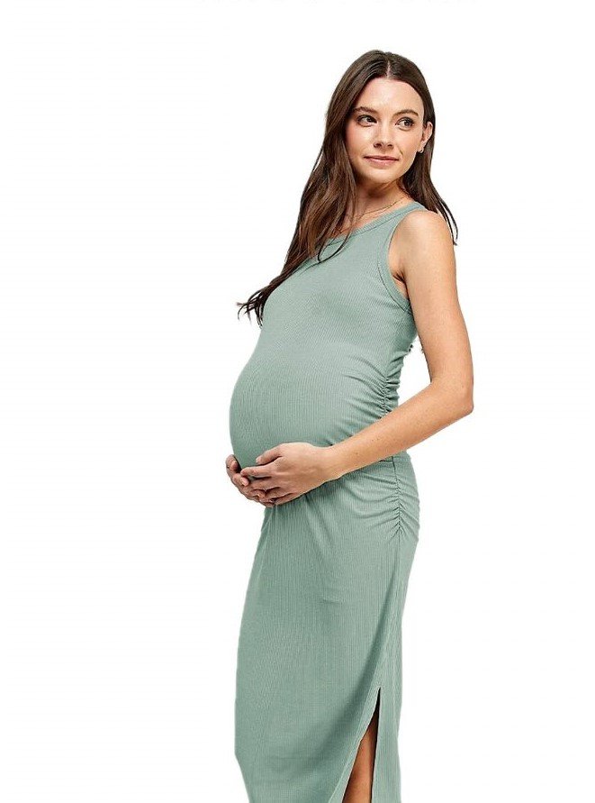 This micro-ribbed midi feels like winter neutrals done right — warm, sculpting, and just dressy enough to glow under soft evening lights. The tie straps add a sweet, feminine detail, while the stretchy fabric hugs the bump with a kind of gentle confidence.
