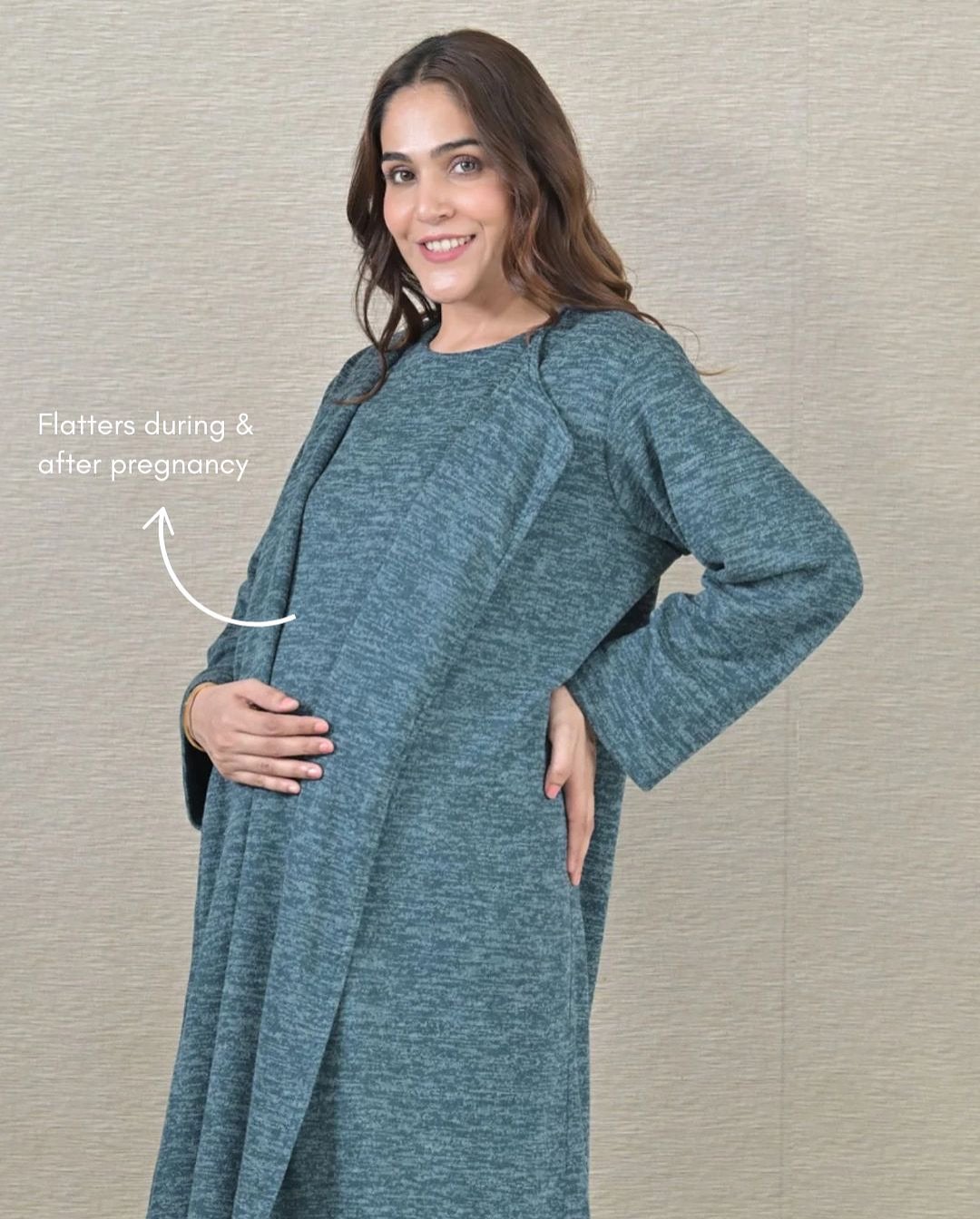 This heathered blue-grey set delivers that quiet comfort-perfect-for-winter vibe — warm, minimal, and beautifully bump-friendly. The outer layer flows softly over the dress beneath, creating dimension without bulk, and the structured sleeves give it just enough polish for daytime outings.