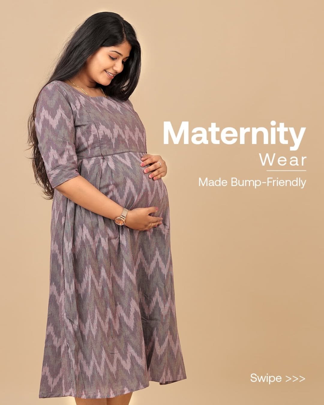 This lilac ikat maternity dress has such a calming, winter-hushed quality to it. The print feels artisan and grounded, and the gentle A-line shape lets the bump sit beautifully without feeling restrictive.