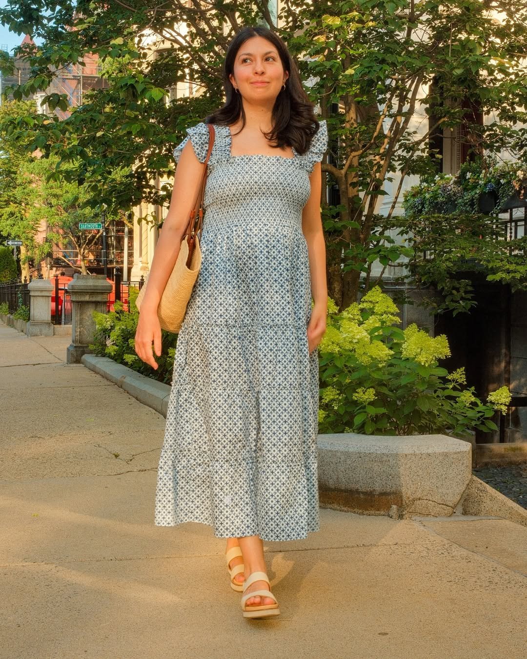 Everything about this patterned midi feels easy and approachable — like a warm walk on a chilly day. The small-scale print and tiered silhouette give the bump a gentle, airy frame, while the neutral sandals and woven bag keep things grounded and relaxed.