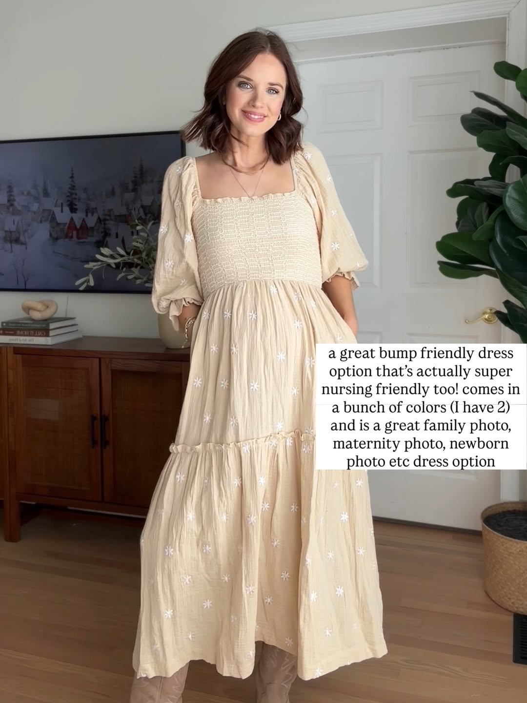 Soft, smocked, and sprinkled with tiny embroidered florals, this dress feels like winter sunshine in clothing form. The puff sleeves and tiered skirt give it this airy, cottagecore sweetness that flatters the bump so effortlessly.