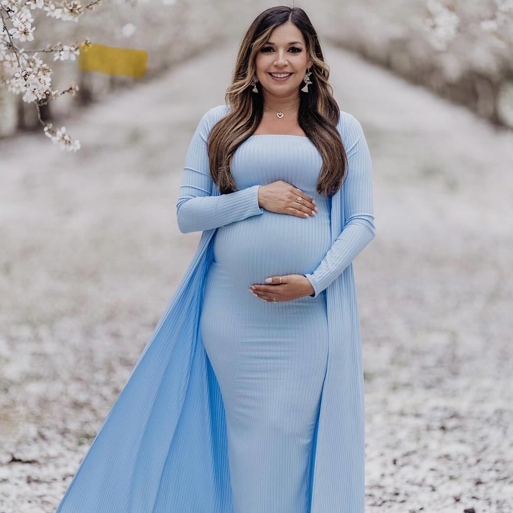 Flowing, ribbed, and beautifully sculpted, this full-length icy-blue gown with the matching duster cape feels like a maternity fairytale moment. It has that “snow queen but make it soft” vibe — dramatic but somehow still gentle.