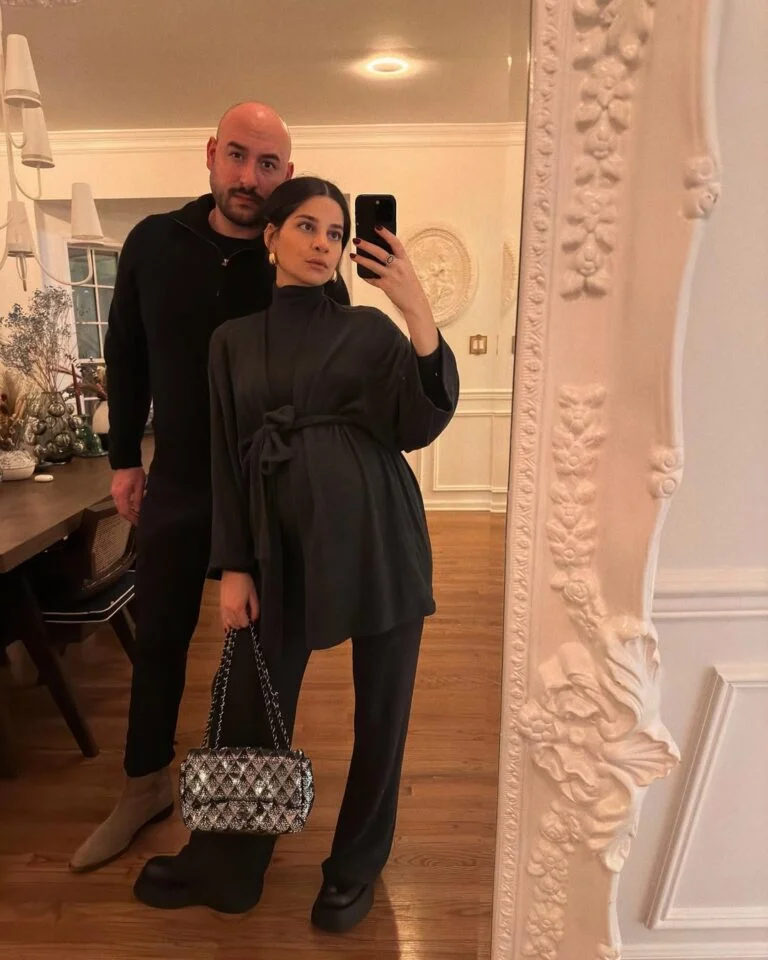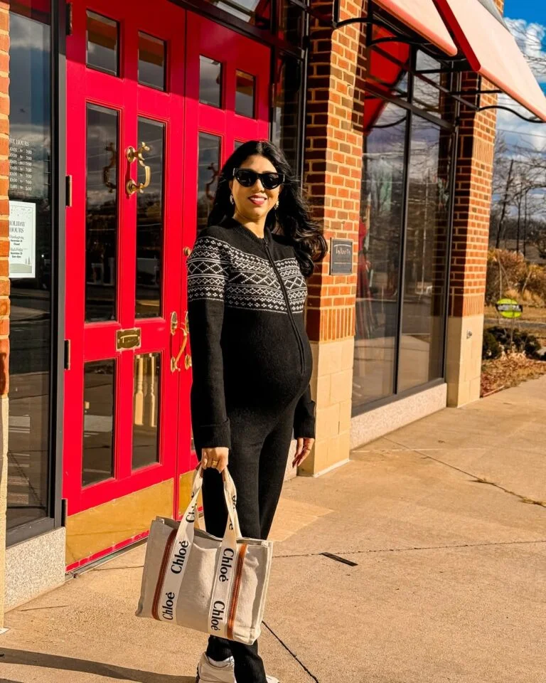 It’s the kind of maternity outfit that feels grown-up, stylish, and ready for a night out — even in the middle of winter. Soft drama, done perfectly.