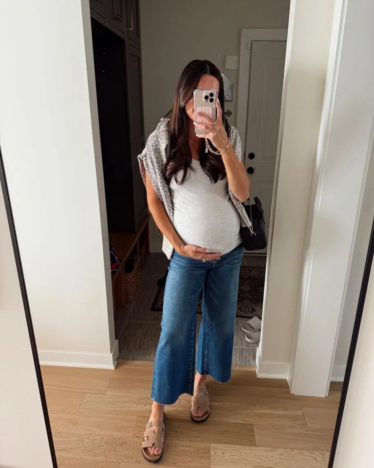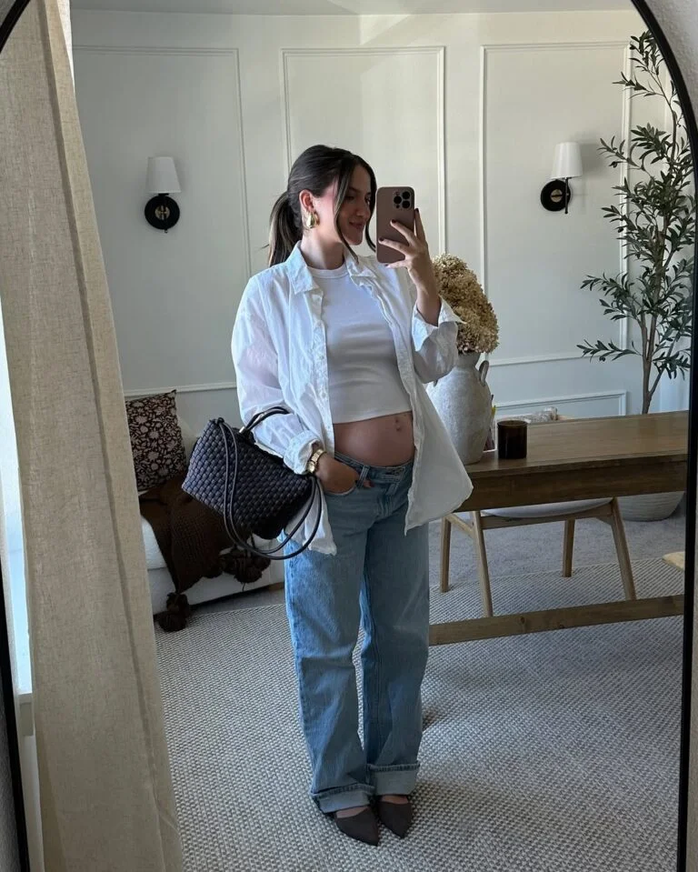 There’s something so refreshing about this crisp white button-down paired with relaxed denim. It’s that cool-girl maternity vibe — casual but with intention. The peek of bump adds just the sweetest touch, making the outfit feel playful yet polished.