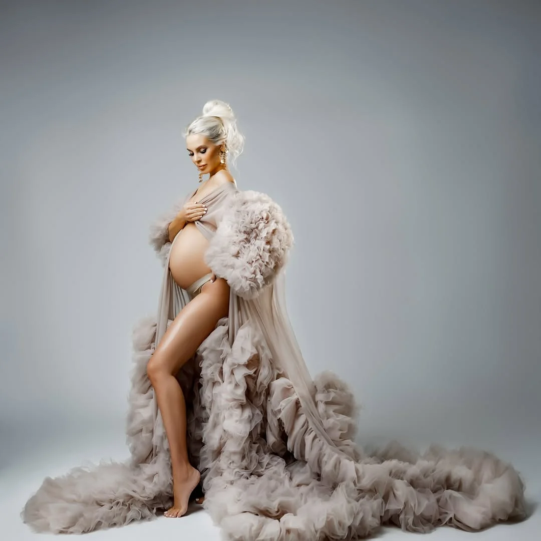 This look is pure winter fantasy — all soft tulle, billowing ruffles, and that ethereal glow only snow-season light can give. The cascading robe frames the bump like a work of art, turning the moment into something sweeping and cinematic. It’s the kind of outfit that makes you feel like you’re floating, even when you’re firmly grounded.