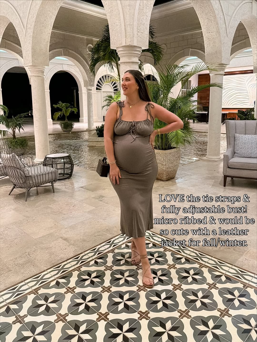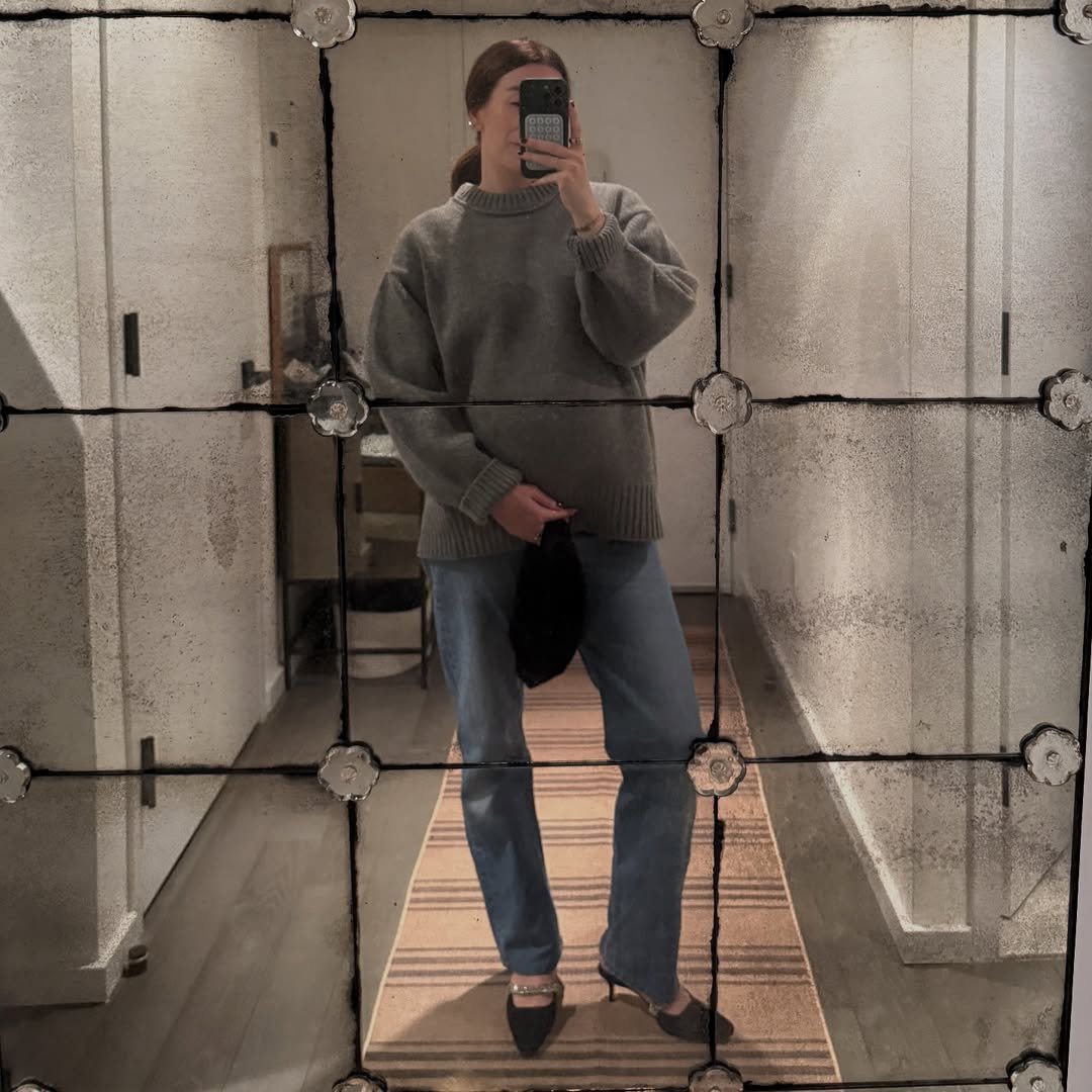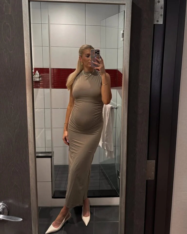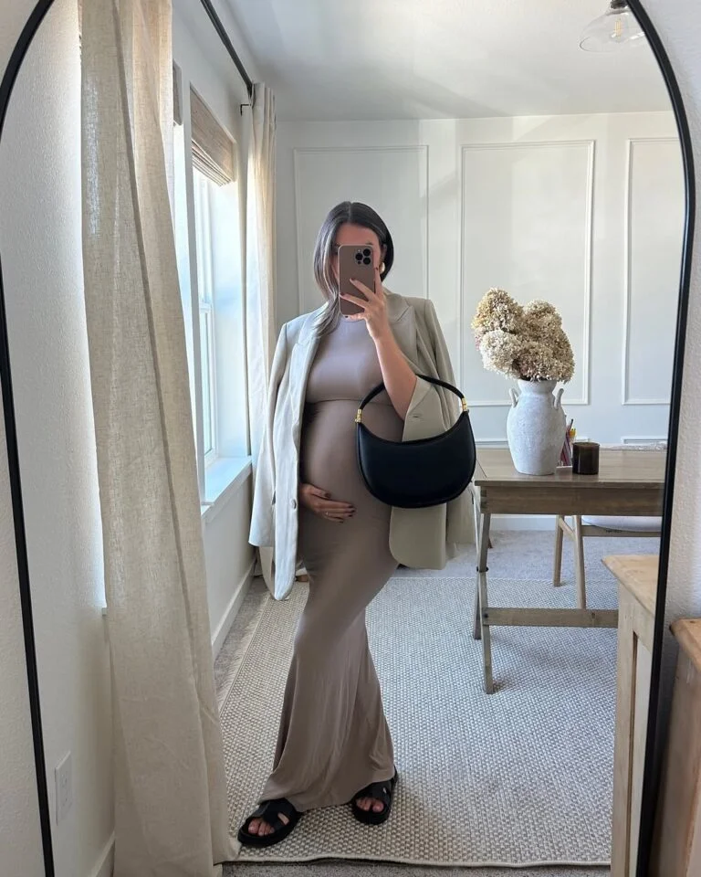 There’s something so clean and quietly glamorous about a fitted taupe dress in winter. The way it smooths over the bump feels effortless, almost sculptural, and the high neckline adds a touch of understated polish. Paired with pointed white heels, it becomes this modern, minimal moment that turns even a simple bathroom mirror into a chic backdrop.
