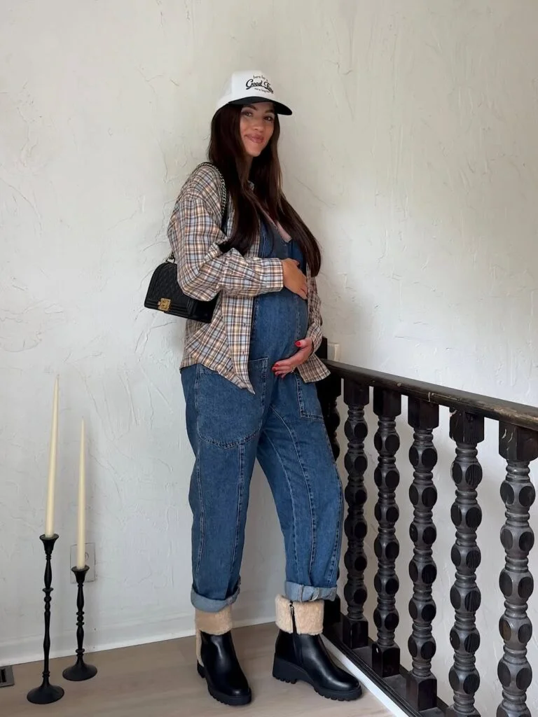 This outfit feels like a cozy winter weekend — easy, layered, and ready for anything. The roomy flannel, the relaxed overalls, the shearling-lined boots… everything works together in a way that’s effortless but full of charm.