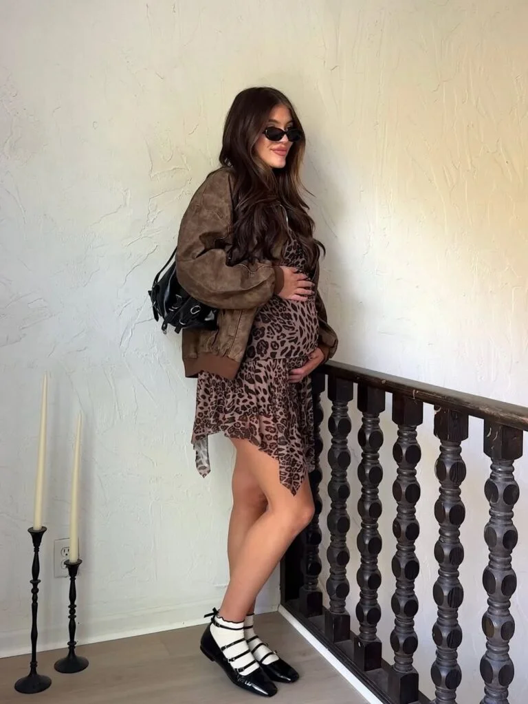 Leopard print in winter hits differently — playful, warm, and full of character. This flowy asymmetric dress gives the bump the prettiest movement, while the oversized suede jacket makes everything feel grounded and cool. The contrast of ballet flats with socks adds a charming, slightly quirky twist.