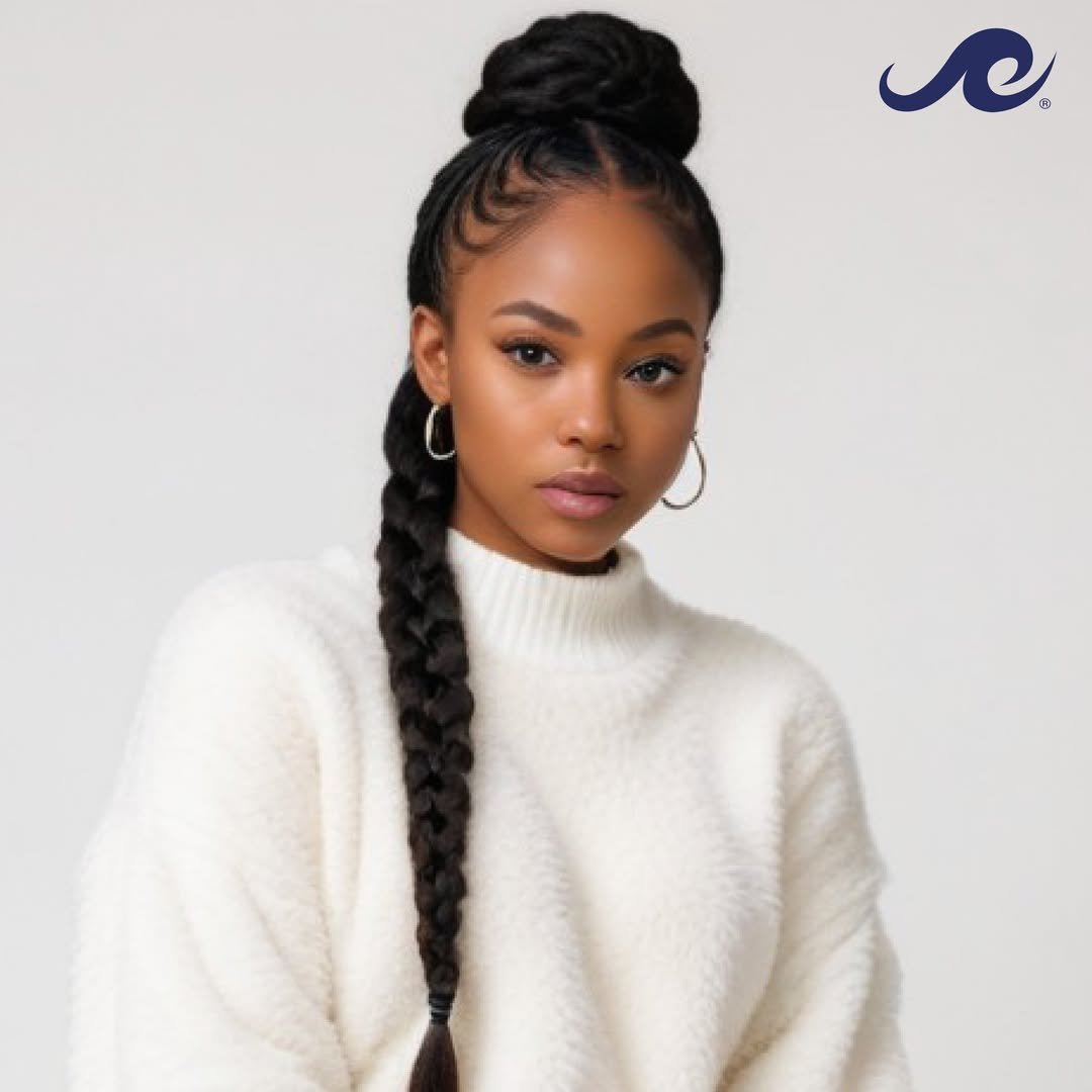 Nothing beats the clean beauty of a sleek top bun cascading into a long braid. It’s polished and modern, with that little winter softness coming through in the cozy turtleneck and minimal gold hoops.