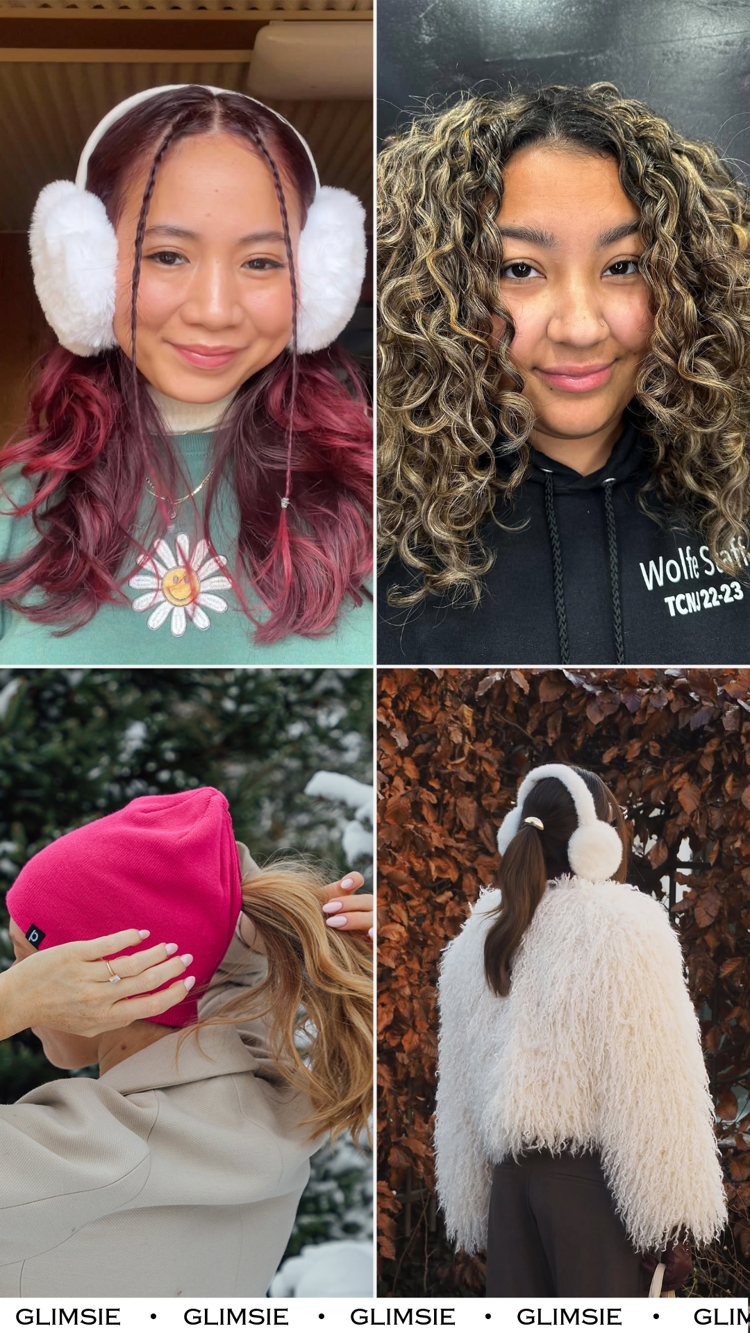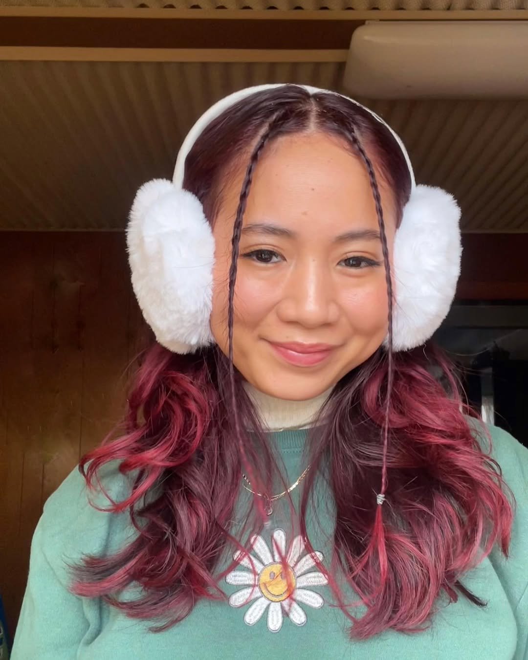 Bright earmuffs and soft berry-toned curls make this the cutest cold-weather hairstyle. The little braided tendrils in the front add personality — like a playful wink peeking beneath all the winter coziness.