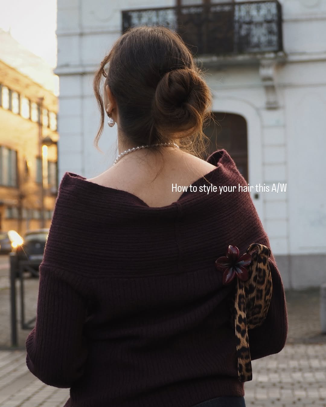 This low twist bun feels like something from a winter romance film — soft tendrils, rich knitwear, and just enough elegance to dress up an ordinary afternoon. The claw clip adds character without competing with the texture of the sweater.