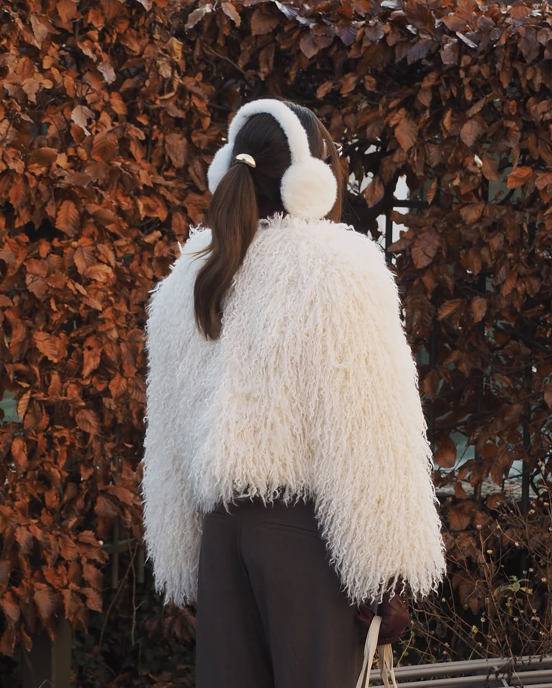 This look radiates cozy energy — the fluffy earmuffs, the textured pony, the soft winter layers. It’s playful but quietly refined, the kind of hairstyle that makes you want to wander through a winter market with a warm drink in hand.